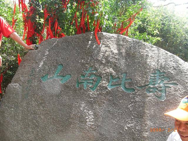 此“寿”字为陈抟所书,高2.15米,陈抟,字图南,自号扶摇子,今安徽亳州人,是中国道教史上著名的神仙道士,史称“陈抟老祖”。有《无极图》、《先天图》、《指玄篇》等著作存世,对北宋影响很大。陈抟善书五尺大字,此“寿”字由“人”、“寿”、“年”、“丰”四字构成。在此昭立。喻意寿比南山。
