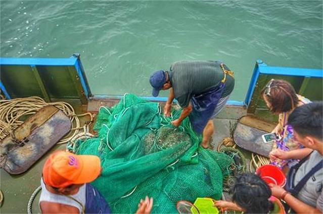 第二天起了个早,坐渔船去任家台出海捕鱼。渔船当然不是真正的渔船了,就是特地供游客使用的观光渔船,真正的渔船是不允许载客的。