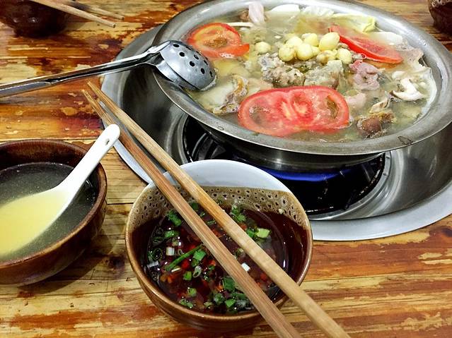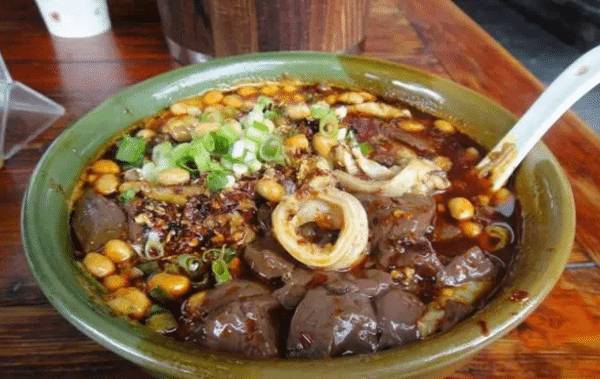 2.大邑县最出名的就是肥肠血旺,而这家血旺经常都要排队!(不过我们当时去的时候还是很幸运的)肥肠血旺20元一份,特别适合两个人吃,肥肠还是挺多的,特别有嚼劲,血旺也是相当的嫩滑可口,下饭!粑粑菜也不错,还有鸭子也可以尝一下。(地址:新场镇太平正街6号)