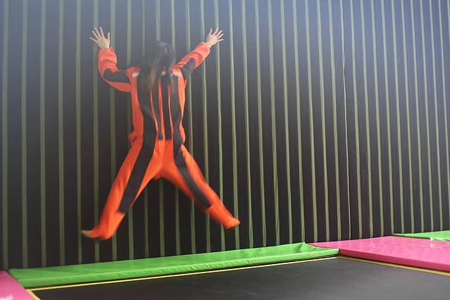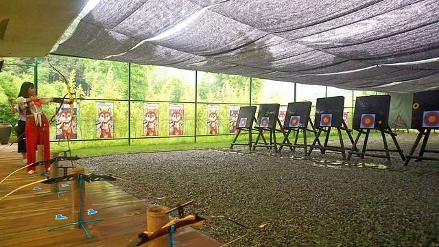 吃完午饭,天空飘来了云朵下起了雨,完全不用担心玩乐的问题,工作人员带我们去室内射箭和蹦蹦床,还有极限挑战节目里的蜘蛛衣活动。