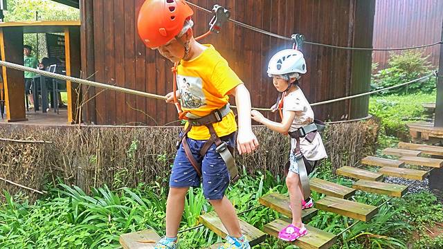 小飞天狐就是小朋友玩的树顶飞索,想要体验树顶飞索需要通过前面的木桩和木板的通关挑战,勇气和胆量是很重的,两位小孩子勇气可嘉。