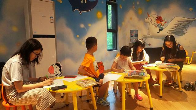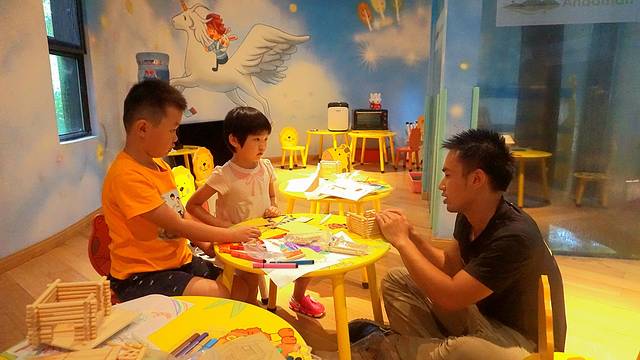 吃完早餐带小朋友去树屋做手工,每个人绘画出自己心目中的树屋,小朋友的思想果真很单纯,然后工作人员小哥哥带他们一起手动搭建小树屋。