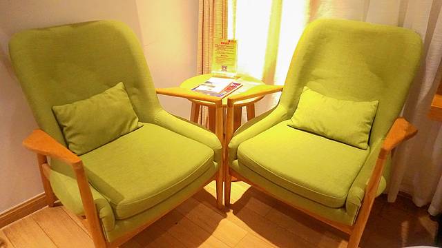 清新的绿色座椅,免费的饮用水和饮料,暖心的是还准备了一些小零食。山间的雨是说来就来的,所以每个房间还配备了两把雨伞,贴心随处可见。
