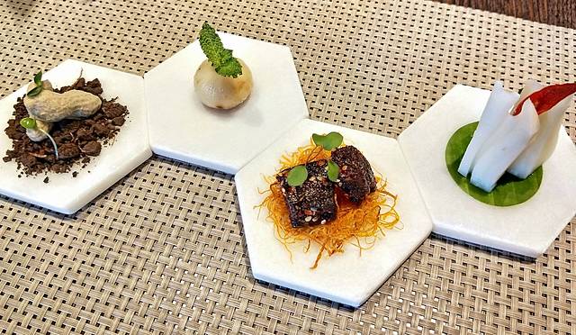安缇缦生态迎宾盘,从左到右分别是鹅肝、大蒜、牛肉、藕块,最左边的乍一看以为是花生呢。