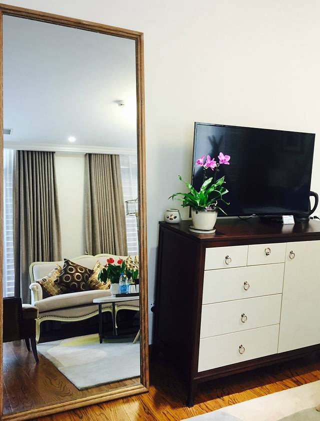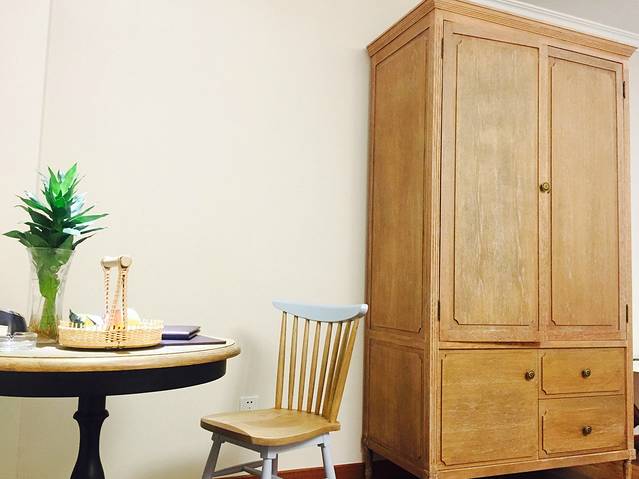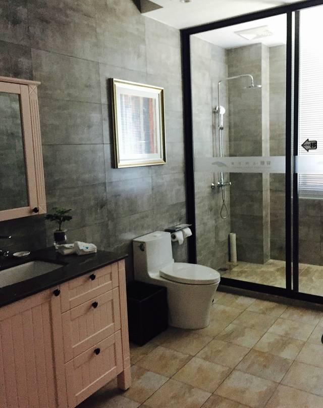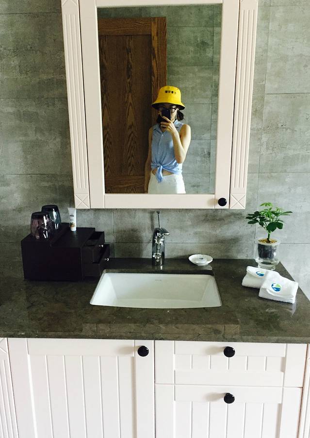 放下行李先上个厕所洗把脸,哇哦,超大空间的卫生间,真是奢侈的让人感动。后现代工业风的泥灰色墙面和少女心的粉色柜子,竟搭配的毫无违和感,甚至美的有点小特色。恩,先自恋的拍个自拍照。