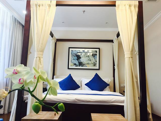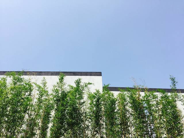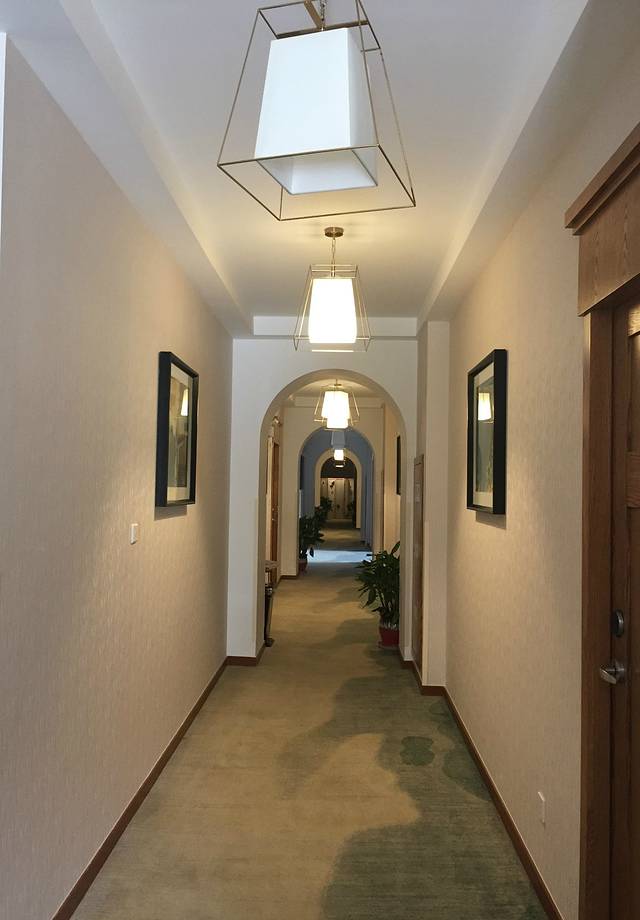 从大堂到客房,会经过一条略蜿蜒的走廊,大红灯笼,巧妙的留白开洞,很有园林移步借景的设计感。新中式的四柱大床配上典雅的蝴蝶兰,古典美呼之欲出。郁郁葱葱的竹子在白墙灰瓦和蓝天白云的映衬下更显江南风味。走廊上的廊灯,也透出一些许中国元素。