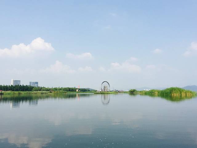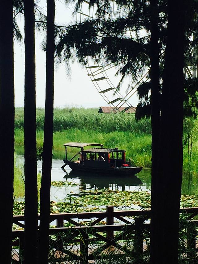下午室外的热浪稍有褪去,乘着酒店的景区景观车,一路沿太湖大道直达太湖湿地公园。乘上小游艇,泛舟太湖上。偶而窜出的湖鸟、湖鸭,似乎在向我们宣告这是他们的领地。在游艇上,游着太湖,听着《太湖美》,吹着太湖风,这应该是太湖游的正确打开方式了吧。