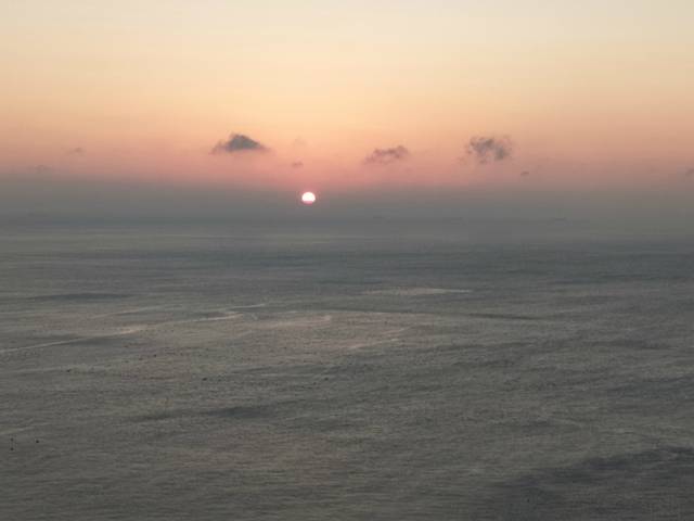 为了不留遗憾,我挣扎再三,还是决定起个大早去看日出。五点不到,就已经来到了佛手石旁的土坡上。这里正在进行建设,据说想要建成一个小公园,以供人游玩。到了这里才发现,厚厚的云层,完全遮住了海岸线,太阳公公在很艰难地向外探出他那笨笨的身子,虽然没有见到海天一线中那一轮红日,但是云彩上的那一圈金边一样美丽。