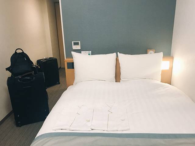 札幌 里士满 站前酒店应该算是典型的商务型酒店吧,很干净很小巧也很紧凑,但是。。。。。太紧凑,真的,我们两人的行李箱摊开就差不多没法走路了。订的大床房,但是床应该是一米五的大小,之前找遍了 北海道 的酒店,基本上百分之八十的大床房都是一米五,好吧。。。可能是 日本 人小巧玲珑吧。