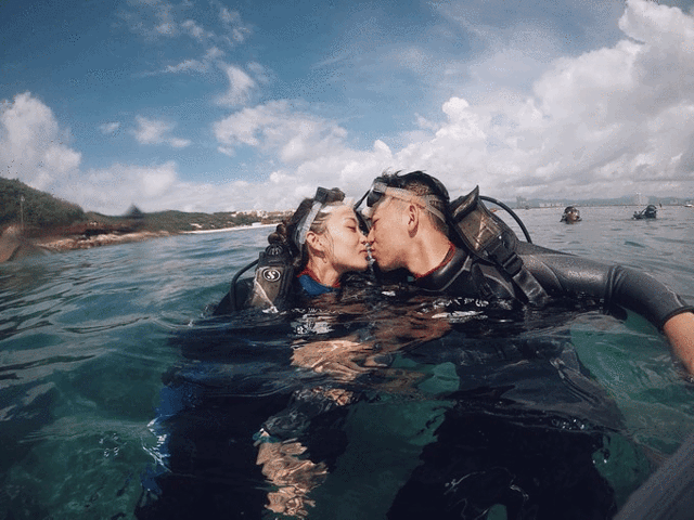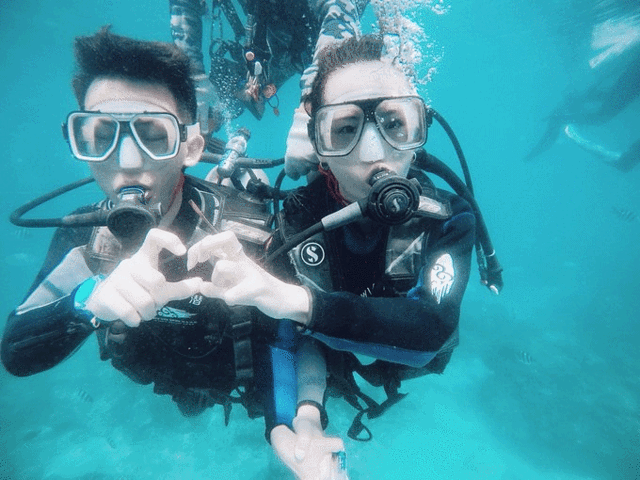 上来水面后,被潜水教练撺掇着接吻合个影!