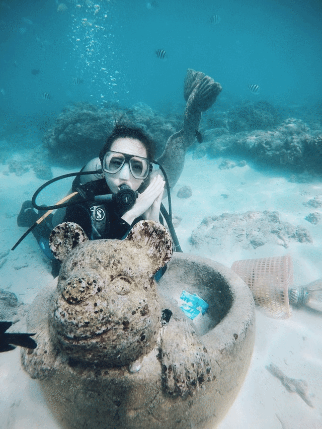 我们两个也是在水面上适应了好一会儿才顺利下潜,一开始就是不习惯用嘴呼吸氧气,越不习惯就会越紧张,她呛了两口水,我也是没次进 水里 适应都会挣扎上来。我们俩几度都想放弃了,但是为了我们约定好的第一次在海里合影,我们没有放弃,坚持适应了一会儿我们终于 成功 适应了!(还别说,真有人当场就放弃了!)
