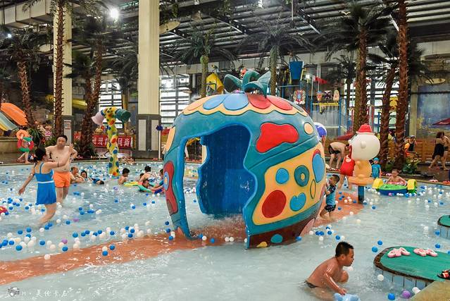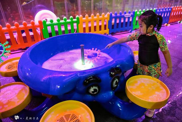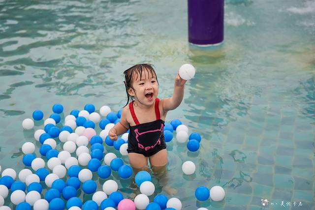 正中区域是一个大型的儿童戏水区,有着蘑菇、苹果等造型可爱的喷水设施,还有散布着白色蓝色的海洋球。这片区域的水非常浅,才刚刚没过小丫头的膝盖,是个连小宝宝也可以放心玩耍的区域,不用担心有太多的危险。