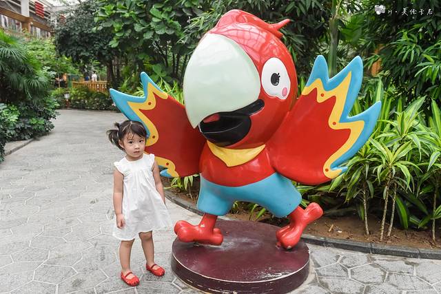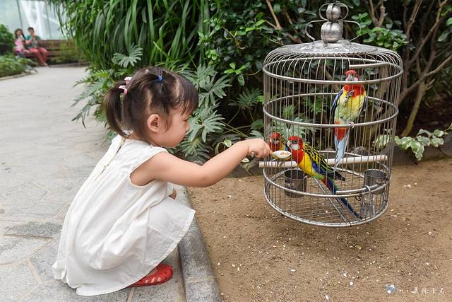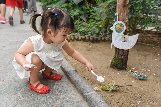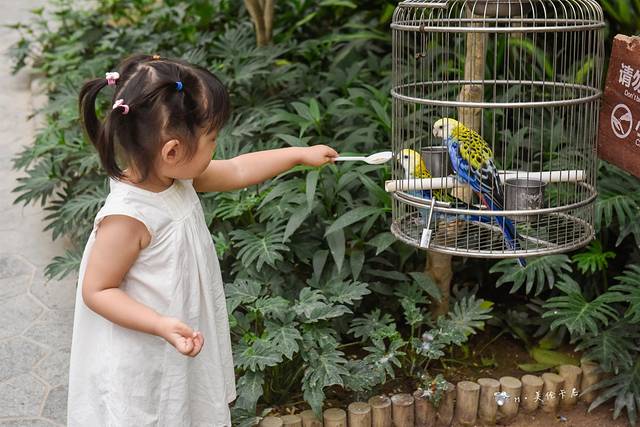不过被锁链拴在树桠上的鹦鹉体型都比较大,看起来有点儿凶,小丫头还是有些怕怕的不敢喂;倒是有些小鹦鹉自由的在空中飞来飞去,或者大摇大摆的在地面上踱步,欺软怕硬的小丫头追着他们喂,虽然有时会被“嫌弃”,但也顺利的被她喂到了几只。