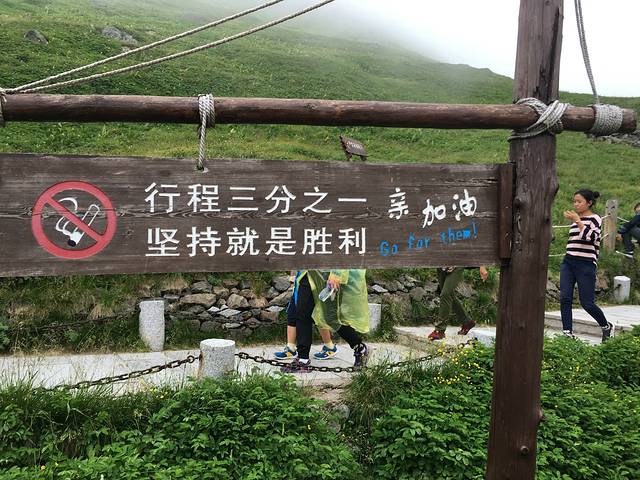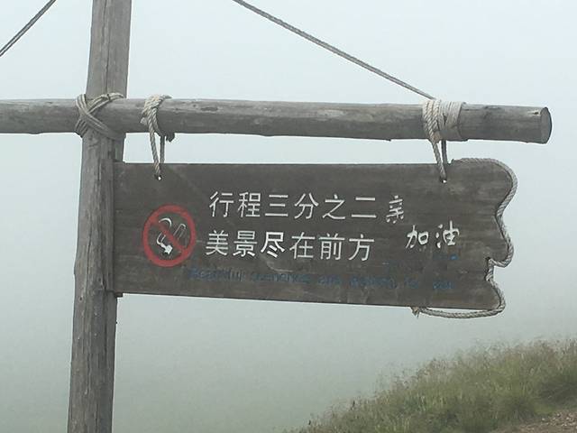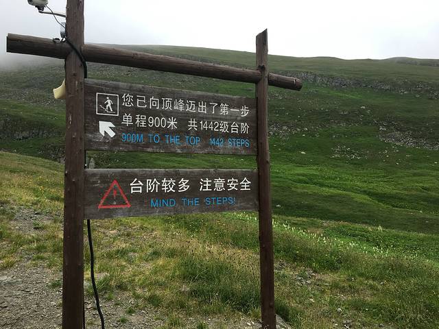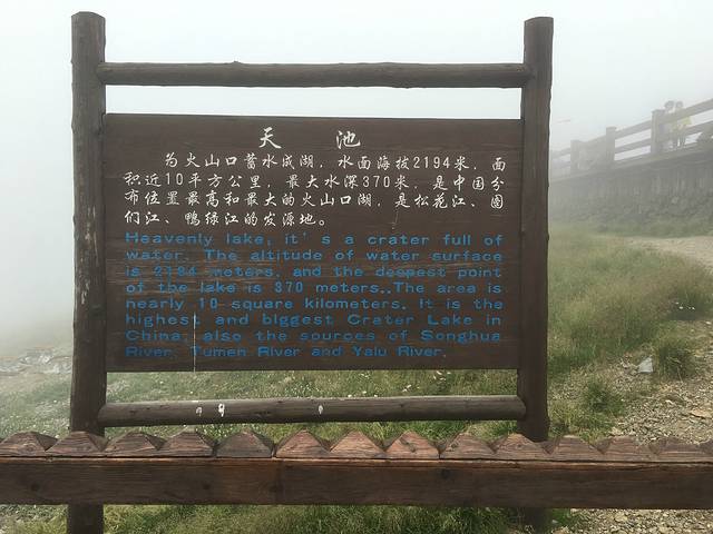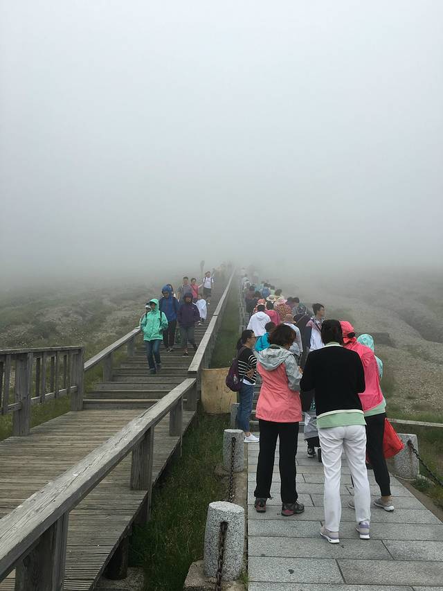 带好食物和水乘9点(一共两班7点和9点)的巴士30分钟到达西坡景区,下车后有度假区工作人员解答各种问题,告知返回酒店最后一班巴士是下午4点半,千万不要迟到。然后就进检票大厅刷身份证进入。坐环保车开40分钟的盘山道到山顶,宝爸成功晕车!一下车大家就纷纷喊冷,赶紧套上防风衣,山顶的工作人员都是穿着长羽绒服上班的。山顶海拔2000米,云雾缭绕,仿佛仙境,我们就估计看不到天池了,但是既来之则安之,1442级木制台阶还是要挑战一下的。气喘吁吁的爬完全程,下山后腿不停的抖啊抖!