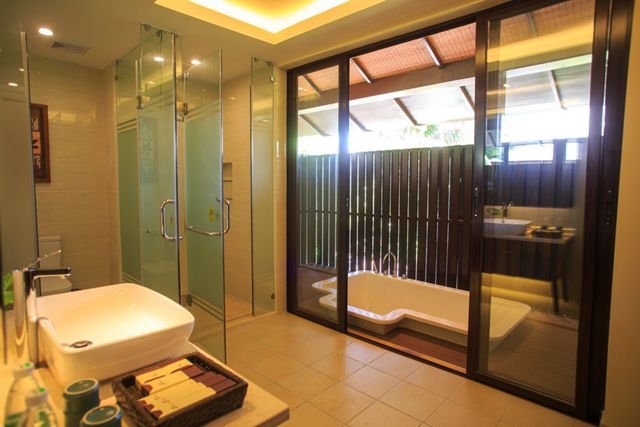 每间卧室都配有独立的卫生间,磨砂玻璃隔开了淋浴间和马桶。露天浴缸很干净,木栏围着浴缸边,低斜的屋檐遮挡住了室外灼热的阳光 卧室虽然看着不大,但是和露天浴缸间还有一个隔间,衣柜、洗手台、马桶和淋浴间安置在这个隔间里。将住和用的功能性区域区分开来,独特又实用。