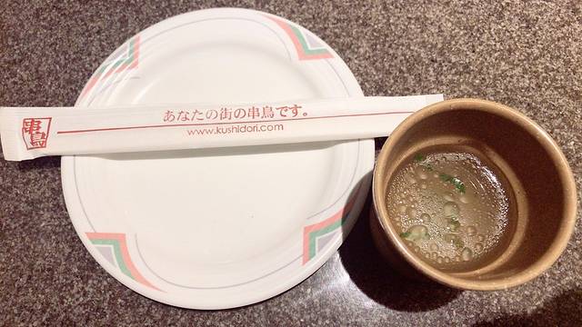 没有茶水,上的是一杯“例汤”,虽然飘着油花和葱花,装在茶杯里面……怪怪的,