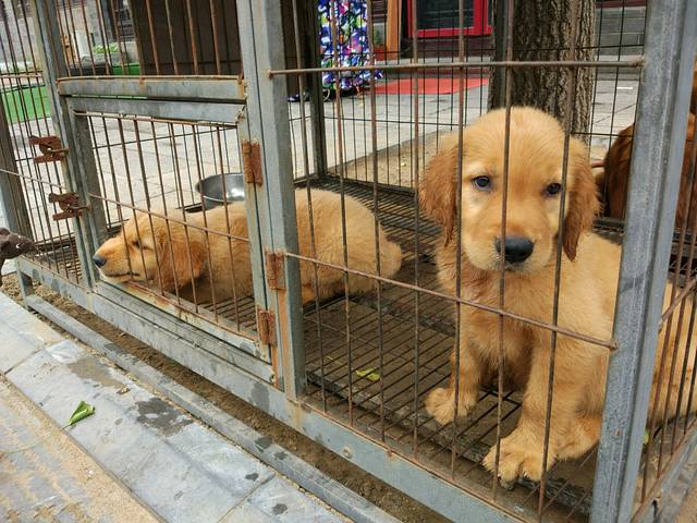 狗妈妈在笼子外,有绳子拴着。有点母子隔离的感觉。