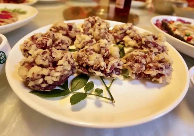 有的将玫瑰花作为装盘的点缀,有的用玫瑰花汁浸染,有的用玫瑰花瓣做馅料,有的直接将一整朵玫瑰花和面用油煎了吃,吃法别出心裁,吃的人也身心愉悦。