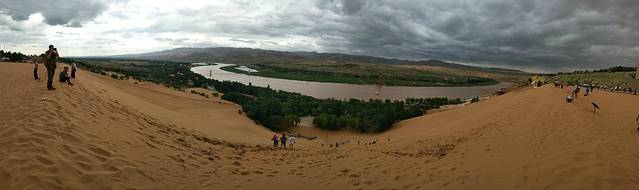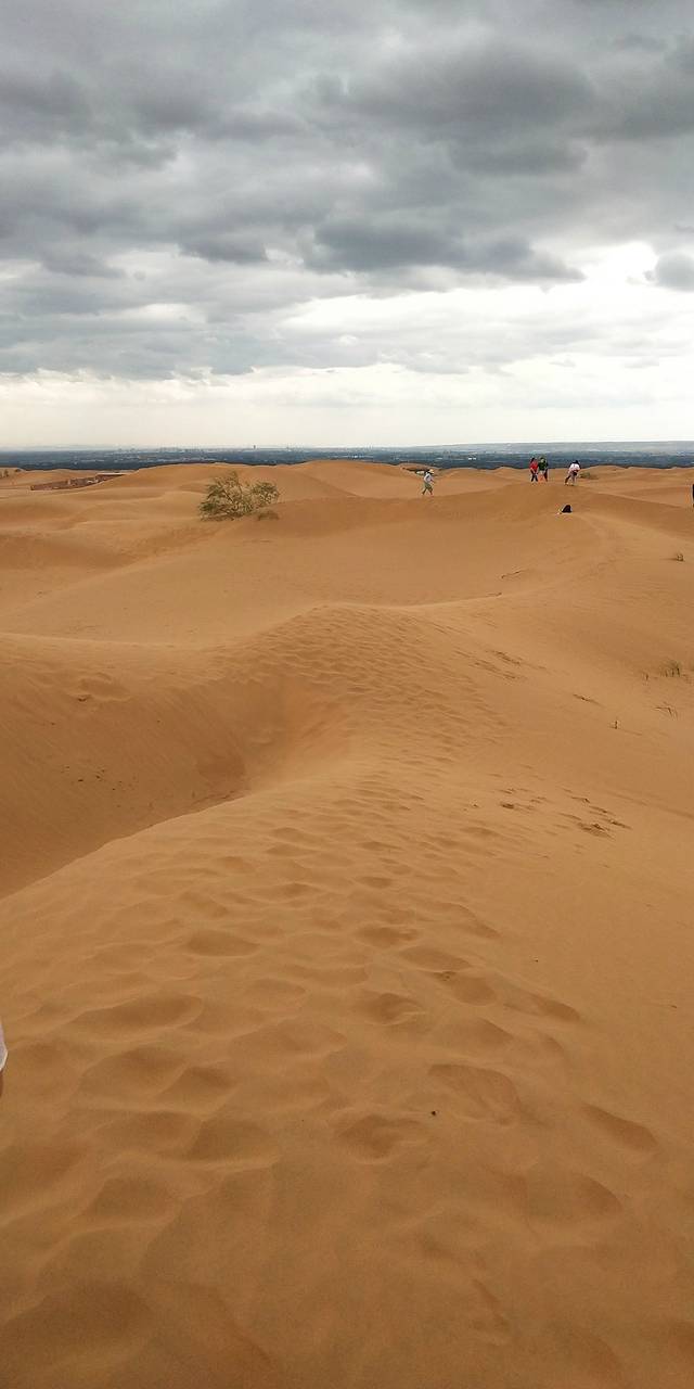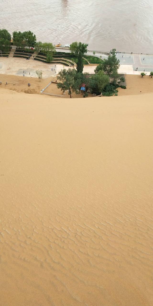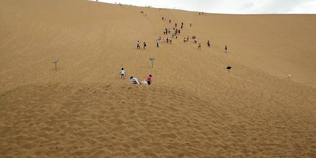 沙坡头景区 ,还好阴天。如果晴天的话一定穿防晒衫。景区南侧有大电梯可以免费乘坐。如果带小孩的可以在门口买个滑沙板。