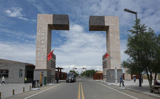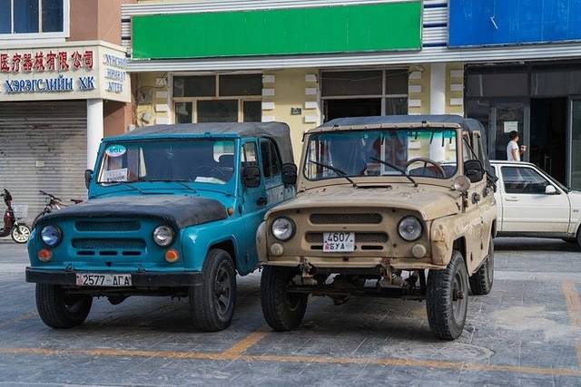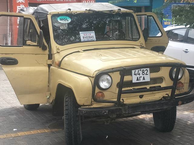 八点起床,出门找了一家叫巴音杭盖的饭店吃早餐,羊肉包子、土豆丝卷饼、奶茶非常有特色。吃完了我们还买了一些卷饼和包子打包带上了车(为了节约时间,这些天中餐我们基本上都是在车上解决)用完早餐直奔国门景区。在二连浩特街头,经常能看见一款前苏联乌里扬诺夫斯克厂产的军用吉普UAZ469,这款吉普在俄罗斯淘汰后被大量卖到蒙古,蒙古人日常会开着它来二连采购中国商品。蒙古国边城扎门乌德当地居民持边民证可以自由出入边境口岸,可以在二连浩特停留三天。在他们看来,和扎门乌德相比,二连浩特的商品物美价廉。
