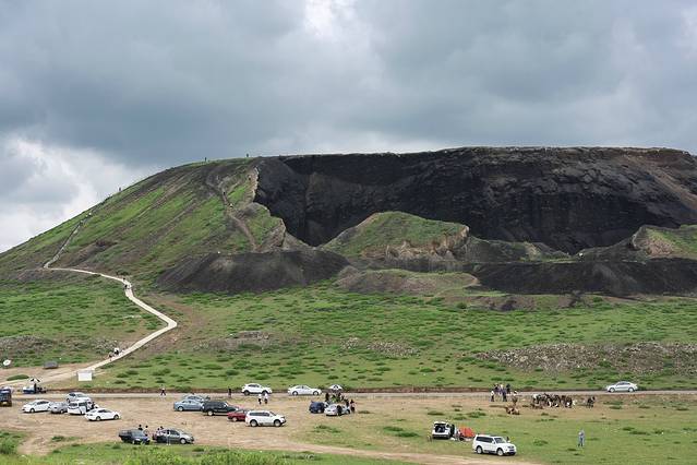 乌兰察布与二连浩特之间基本都是草原,为了方便随时停车,我们有意避开了高速,沿途风景美不胜收,全程340公里,走走停停,用了一整天的时间,途经乌兰呼少海子、乌兰哈达火山群、锡林郭勒草原、朱日和。乌兰哈达火山群位于内蒙古察哈尔右翼后旗乌兰哈达苏木境内,是1亿多年前火山爆发形成的死火山,最近的一次喷发距今大约6000万年以前。火山规模较大,结构完整,基本未遭受剥蚀,6座形态各异的火山连成了一线,首尾相距约10公里,我们参观的北炼丹炉火山是其中一座,山的坡面上修有登山栈道,可以登上山顶看见形态清晰的圆形火山口。有趣的是,这里的火山一直被认为是死火山,可前几年来了位地质学家,实地考察后断论,说这是年轻的活火山!天知道是真是假。晚上七点左右到达二连浩特。