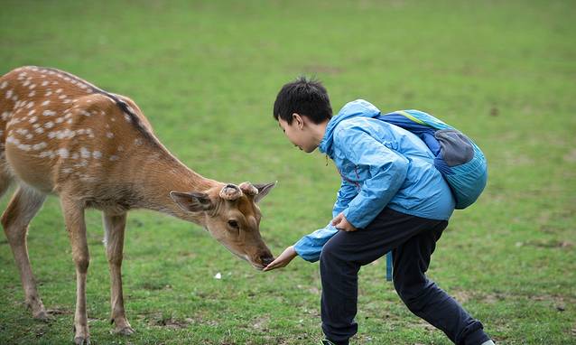 小朋友可以跟梅花鹿零距离接触,但也有被鹿踢的风险
