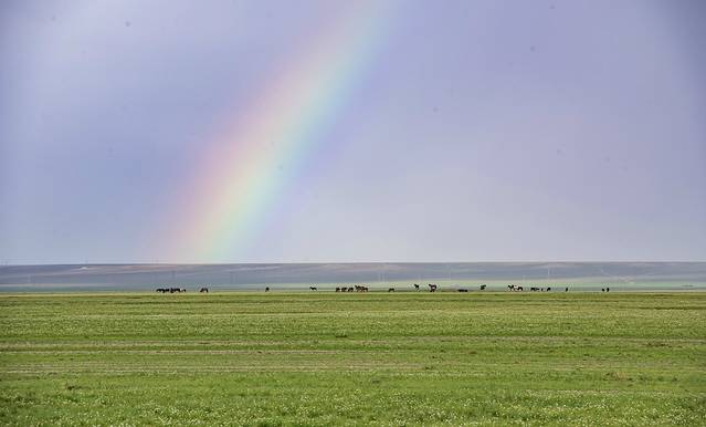 下午四点我们离开五当召,前往希拉穆仁草原,夜宿草原蒙古包是这一趟旅行让我最为期待的核心内容。希拉穆仁草原距离五当召140多公里,全程都是省、县、乡道,沿途草甸花海,绵延不断,田园牧歌,美不胜收。希拉穆仁草原位于内蒙古自治区达尔罕明安联合旗,是典型的高原草场,也是内蒙古最早开辟的旅游点,海拔1700米,丘陵起伏,芳草萋萋。草原上昼夜温差较大,早晚十分凉爽,素有“早穿棉袄,午穿纱,夜晚抱炉吃西瓜”的说法。