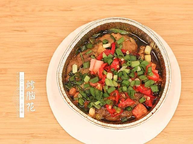 用猪脑子,拌之以海椒末、花椒粉以及其他佐料,火烤而成。烤脑花气味醇厚,入口绵软,香而不腻,油而不肥