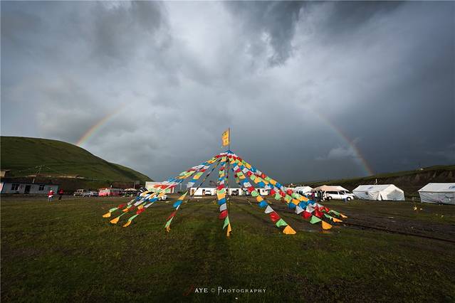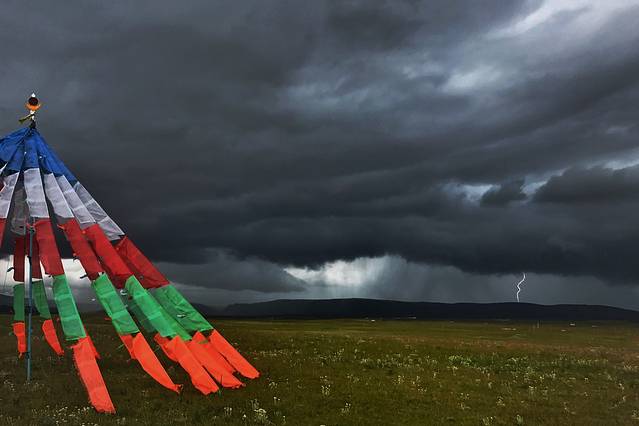 我们在遇到闪电的时候,心想,一定要闪电一定要拍闪电,于是跑到牧民的草地上,借经幡当前景,拍到我们心仪的闪电。手机也出大片。