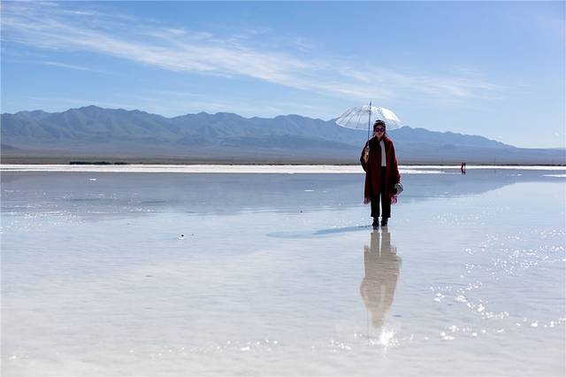 想要一张美美的天空之境,一定要有风平浪静的水面。每次我站在冰冷的盐湖里,静静等待按下快门的那一刻,要等很久很久;一会儿一个人影闪过,一会一层波浪荡来;实在是受不了脚底下的痛,跟洋哥说了一句:好了好了,就这样吧,回家把他们都P掉,冷死老娘了。再美我都没有心情欣赏了!