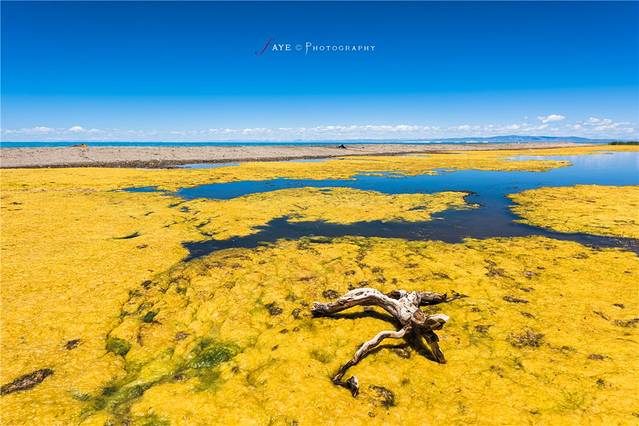 碧绿的海水与黄色相结合,远处的山,近处的浪,比画还美。