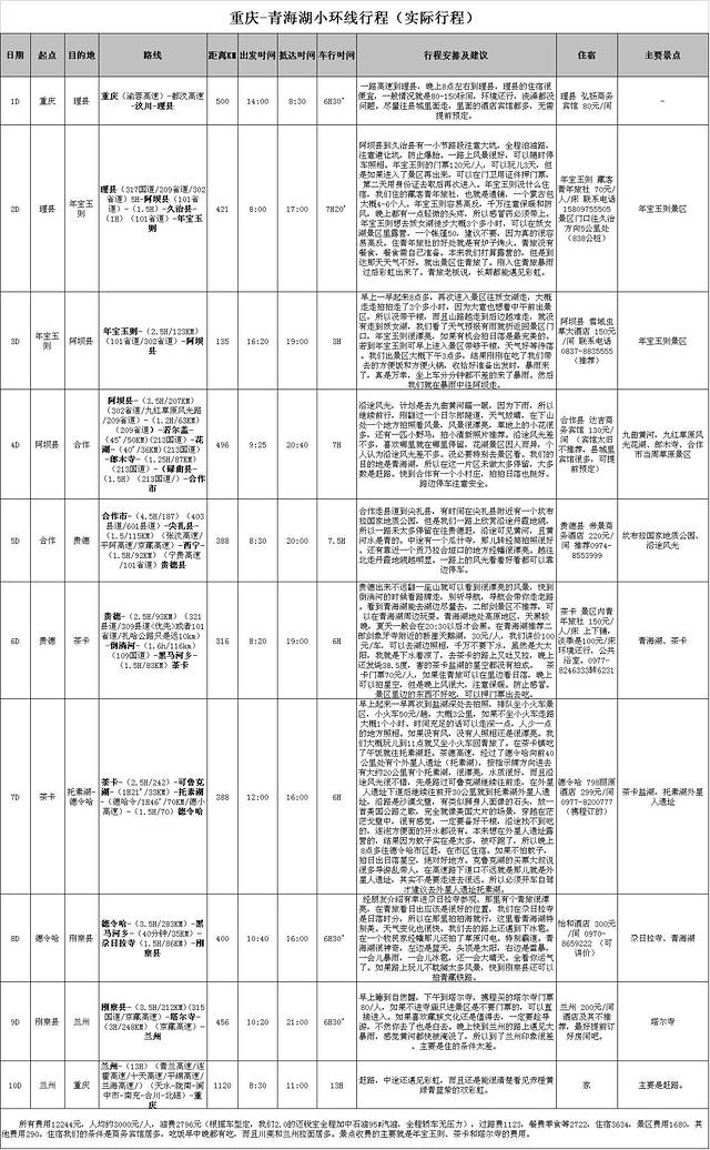 所有费用12244元,人均约3000元/人,油费2796元(根据车型定,我们2.0的迈锐宝全程加中石油95#汽油,全程轿车无压力),过路费1123,餐费零食等2722,住宿3634,景区费用1680,其他费用290。住宿我们的条件是商务宾馆居多,吃饭早中晚都有吃,而且川菜和 兰州 拉面居多。景点收费的主要就是年宝玉则、茶卡和塔尔寺的费用。