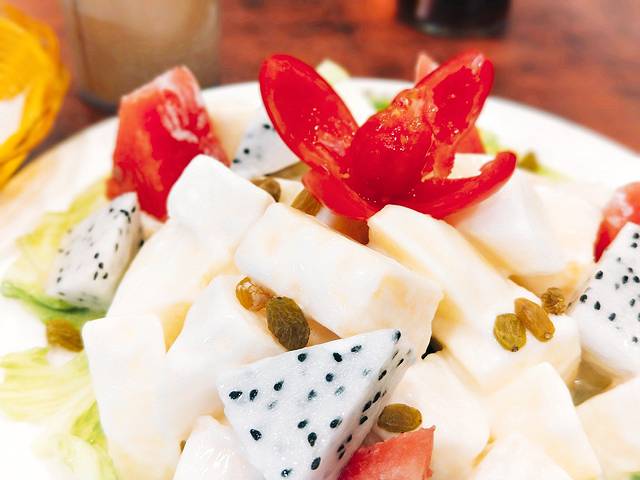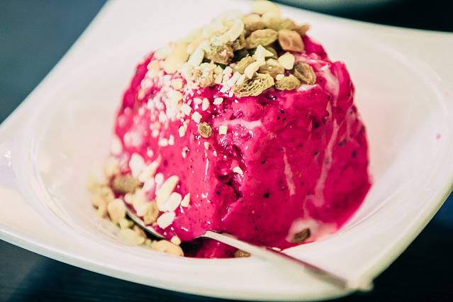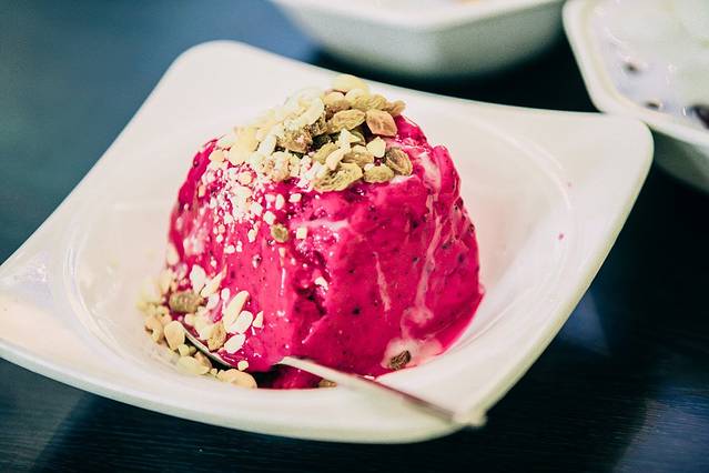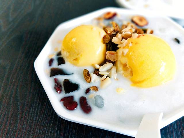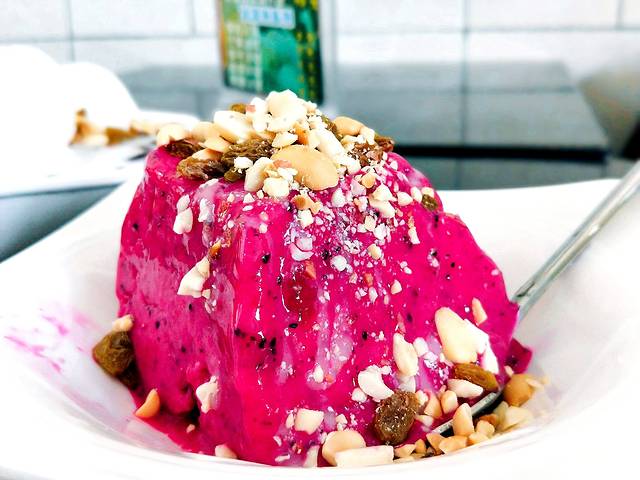 或许是容器原因,这里的水果炒冰看上去分外诱人。我们点了火龙果炒冰,玫红色的炒冰放置了一小会,略略有些融化,令表面更显 光泽 。顶端洒了些花生碎和提子干做点缀,挖上一勺,很绵密的口感,似乎能货真价实的感受到水果的新鲜度!配上香脆的花生和酸甜可口的提子干,口感很赞