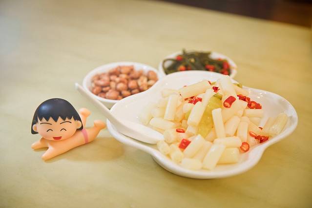 刚坐下一会,服务员就把免费的小菜端了上来,有海带丝和花生米~海带尝了一下,感觉辣辣的正和我口味。