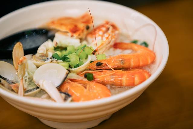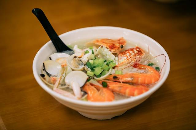 我们点了抱罗粉和海鲜粉。海鲜粉的售价会贵一些,我原本以为海鲜粉里只是放几个贝类,但店家加了数只大虾,还放了两个蟹钳,而且海鲜都很新鲜干净!配上精心熬制的猪骨汤,加入调味的芹菜碎,色香味俱全。这一碗海鲜粉的确诚意满满,性价比很高。