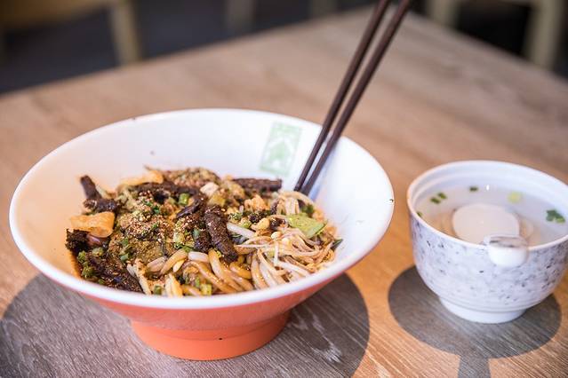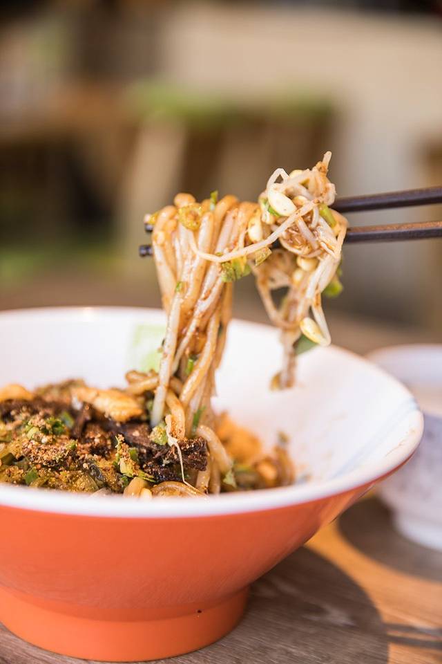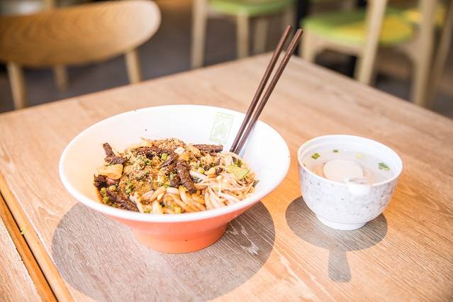 用筷子拌均匀后,吃上一口味道浓郁,很香。豆芽脆脆,粉也入味,秘制的牛肉干干湿度正合适,紧实而有嚼劲。总体评价不错
