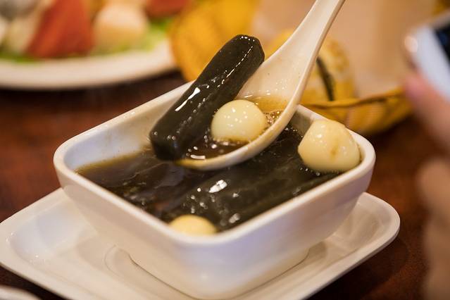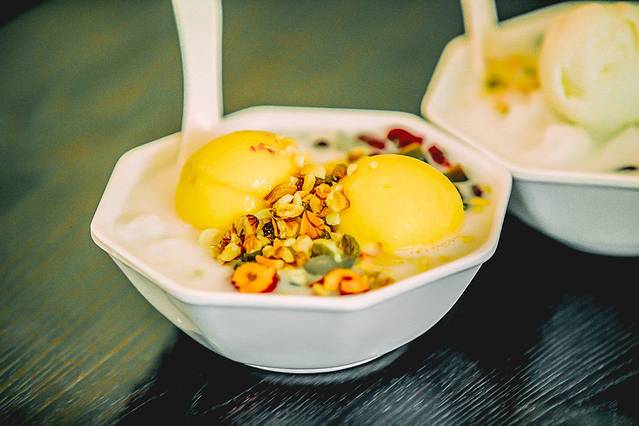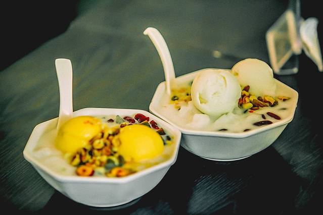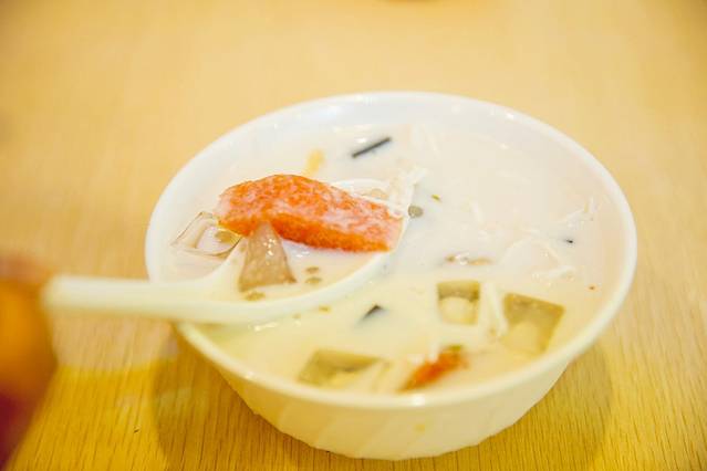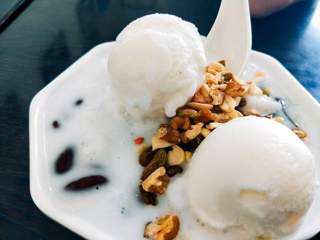 这里的清补凉也是一绝,我们买了两份,一份芒果的,一份椰奶的,原本以为是里面放上芒果块,结果发现不是。在添加完传统清补凉的豆类、薏米、龟苓膏、椰奶等外,每一份都加上两个大大的冰淇淋球,最后再洒一些花生粒、干枣片、核桃碎,营养美味又好看,在椰奶的香浓中又多了丝干果类的香脆和冰淇淋球的绵密!