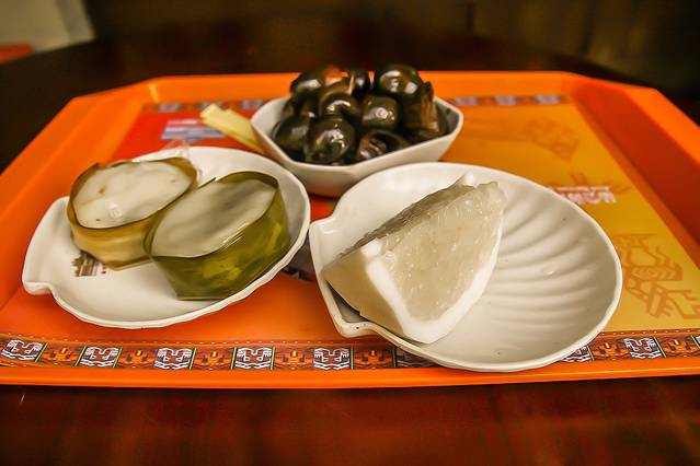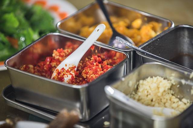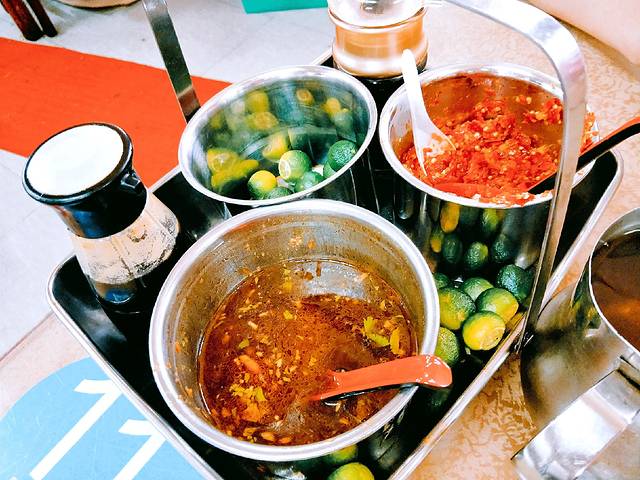 点了两盘肉,即便再好吃,也多少有些腻味。但正宗的 海南 菜上桌后,店家都会供应一些蘸料,有蒜末、黄灯笼辣椒或者红辣椒,生抽等等。通常还会有地道的 海南 小金 桔,味酸,可以用作天然醋,调节口味。蘸上自己调制的蘸料后,果然去了些腻味。
