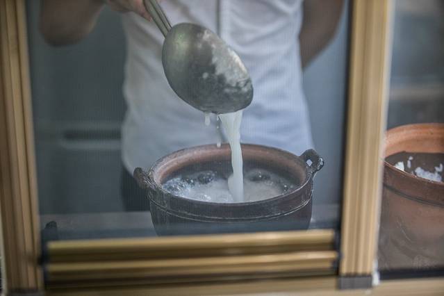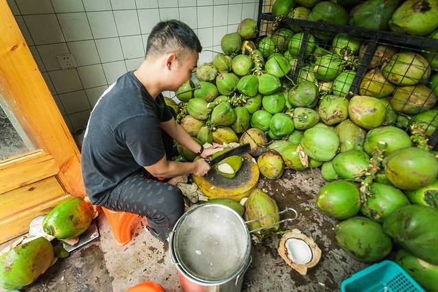 入口处堆放着数百个新鲜的椰子,店里的服务员将椰子两头砍去,挖出一个小孔,将椰汁倒入一旁的桶里。我还在好奇为啥不直接将椰汁倒入锅内,那样更有仪式感一些,而要多次一举再处理。后来经店家解释才明白,原来,纯椰汁作汤底,甜度太高,影响口感,需要按一定比例兑些水,这样才能保持最佳口味。