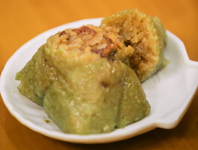 点了一颗也是店里招牌的粽子,是咸肉粽,体积硕大,吃上一颗就有满满的饱腹感。用筷子从中间夹断,露出了里面的瘦肉和咸蛋黄。总体而言口感不错,适合当主食。