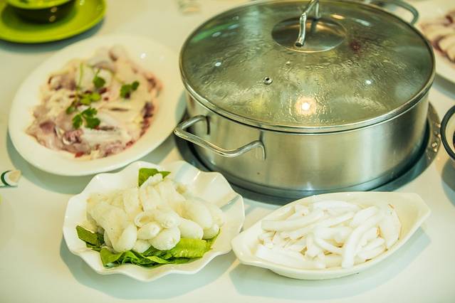 除了吃鲜嫩的鸡肉,还可以根据食客喜爱,点一些常见的海锅涮菜,如菇类、青菜等。但我们只选了特色的马鲛鱼丸。鱼丸被装在一个汤勺里,勺的柄特意做成了弯弯的形状,方便挂在锅边。记得千万别煮太久,以免煮老,在滚烫的锅里放上一小会就可以吃。鱼丸口感细腻又富有弹性。