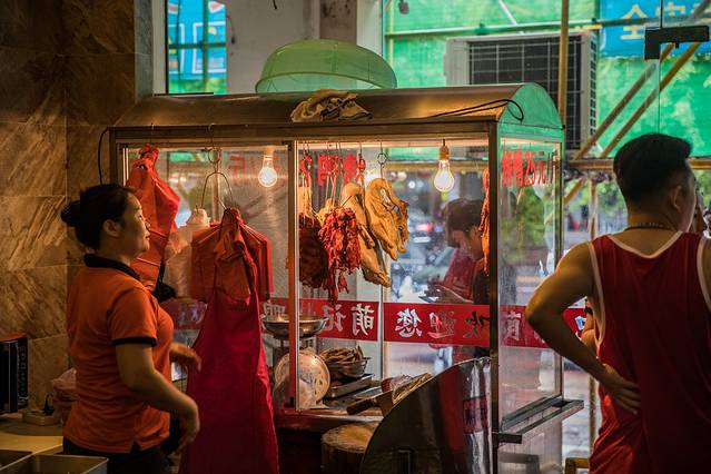 这家店在第一市场附近,走路就可以到。店面不算小,环境也一般,即便中午十二点过去,也仍需开灯。不过,店的名头可不小,极限挑战来过这里取景,墙上还贴有张艺兴制作烤鸭的照片。另有一些名人也曾到访过此店。
