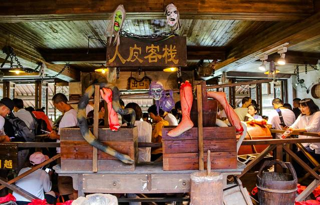 喜欢刺激的朋友,不能错过了,这人皮客栈听名字还是很吓人的,妹说进入人皮客栈就好像是在黑暗中聆听恐慌的回声,亲身感受阴阳怪气。胆大的朋友还真不少,胆小的我可惜我没有进去体验一下。