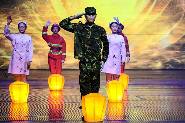 此时台上的效果已把观众带入到2008年5月12日的那场汶川地震,相信全国人民都记忆犹新。