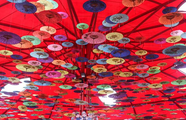 没看错,这就是入口验票处,映入眼帘的是由一把古香古色的红色油伞装饰成的大厅,四周也是仿古装饰,颇有意思,我们早早的来到景区,但看到这人海,就知道这热度果然不一般,验票处还排着长长的队。