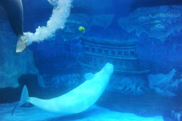 这里有南极和北极的动物 我觉得很神奇 好像自己置身于世界两端一样 不得不说这安排的巧妙�我们在这先看了北极的白鲸 白鲸给我感觉就是真的可爱 它能发出很多声音 看了之后真的喜欢它哈哈��之后去旁边的北极熊 同样是北极的物种 �显得很庞大嘛哈哈�北极熊小时候我记得它是北极的代表 今天看到了它憨憨的样子 嗯 也算是离世界近了一步���接着我们走过去看到了海狗 企鹅和水母���� (南极的代表出来了 嗯 我离世界更近了)不得不说 极地馆有个360度水中通道和水中观景大厅 我们俩走进去感觉它们就在我们身边 而我们就在海洋深处 真的太美了。