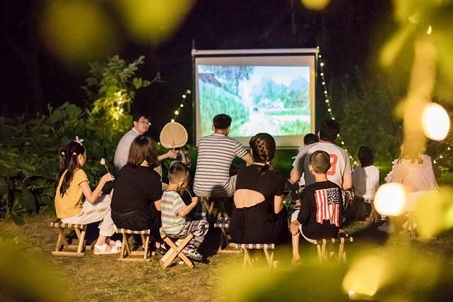 夜幕降临,小院外的草坪上已经布置好了场景,远山里、梯田上,一场星空下的草坪电影,引来了无数院里的小朋友和村子里的小朋友,又多了一些小伙伴~