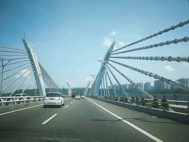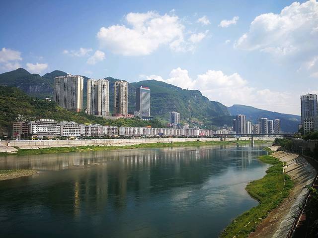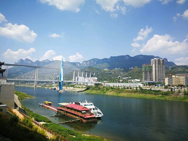 贵州省思南县城清凌凌的乌江水,蓝盈莹的天空。后方的桥梁是G56杭瑞高速公路桥。