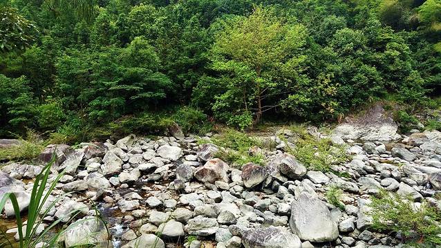 既然是峡谷,那这里的石头自然也与别处不同,怎么说呢?这里的石头一点也不秀气,随便找一个僻静的角落,都不难发现这些大型的石块,它们棱角分明,就连青苔也是细细密密的长在其中某一面上,如同一个个颇有个性的青春期少年,浅滩上的石块更不必多说,大小不一,形态各异,有一些在水流的侵蚀下,会出现一个相对光滑的面,但是又都各自保留着自己的棱角,还有一些直接堆积在水中间,清澈的潭水映衬着大块的乳白色石头令人无法忽视它们的存在。