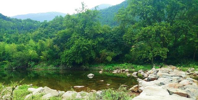 这里的水潭也是吸引人慕名而来的重要原因之一,俯视整个潭水你会发现,又清又浅(当然了,事实证明浅只是因为水的折射原理),岸边高大的树木和潭水中清澈的倒影交相呼应,是许多摄影师都拒绝的和谐画面,我们在一方不大的水潭旁边停留了很久,假模假式的搞了很久的“摄影创作艺术”,最令我满意的一个视角,莫过于一个脚下是水,远处是山,两岸是层次分明的绿,正是应了那句人在画中游。